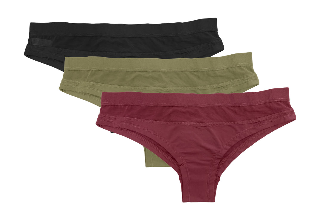 Cheeky: Cheekies work in reverse, with thicker sides, moderate front coverage and a nice backside exposure. Added bonus- cheekies tend to hide panty lines almost as well as thongs!